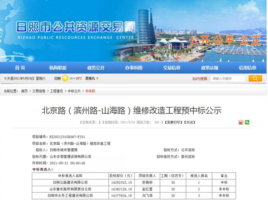 5月26日,集團建設公司憑借豐富的招投標經驗和雄厚的技術實力,經過資格審查和投標競價等環(huán)節(jié),成功中標北京路(濱州路-山海路)維修改造工程,中標金額1428.23萬元。