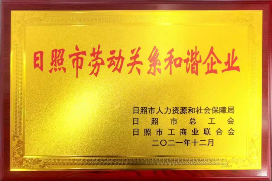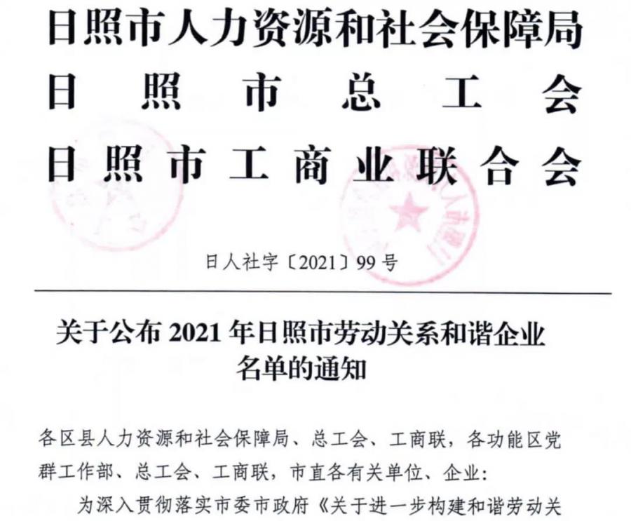 近日,經(jīng)日照市人力資源和社會(huì)保障局、日照市總工會(huì)、日照市工商業(yè)聯(lián)合會(huì)研究,決定授予集團(tuán)“日照市勞動(dòng)關(guān)系和諧企業(yè)”榮譽(yù)稱(chēng)號(hào)。