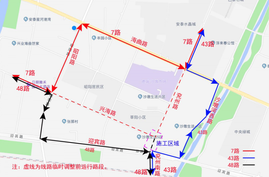 因兗州路(迎賓路至興海路)路段封閉施工(工期約2天),致使運行該路段的公交7路、43路、48路無法正常通行。為最大限度減少道路施工給乘客出行帶來的不便,6月1日起對上述線路進行臨時調整,待具備通車條件后再恢復原線路運行。具體如下:
