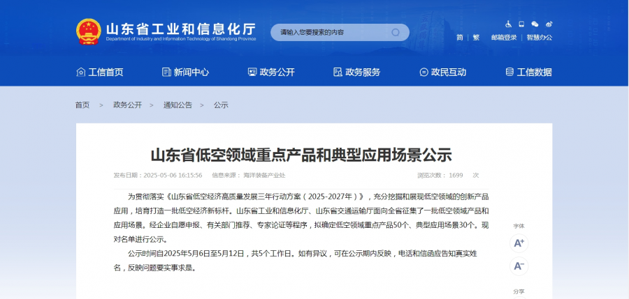 5月6日,山東省工信廳、省交通廳發布了山東省低空領域重點產品和典型應用場景公示。據了解,為貫徹落實《山東省低空經濟高質量發展三年行動方案(2025-2027年)》,充分挖掘和展現低空領域的創新產品應用,培育打造一批低空經濟新標桿,山東省工業和信息化廳、山東省交通運輸廳面向全省征集了一批低空領域產品和應用場景,經企業自愿申報、有關部門推薦、專家論證等程序,擬確定低空領域重點產品50個、典型應用場景30個。此次公示時間自2025年5月6日至5月12日,共5個工作日。