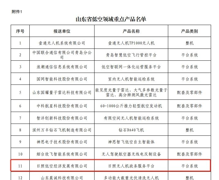 其中,集團低空經濟公司報送的“日照無人機政務服務平臺”名列低空領域重點產品名單。