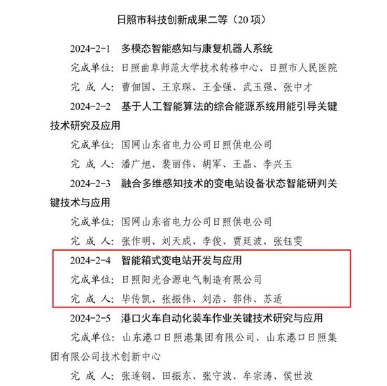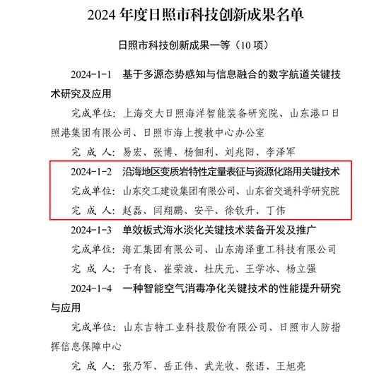 近日,日照市政府公布了“2024年度日照市科技創(chuàng)新成果”名單。其中,山東交工建設(shè)集團“沿海地區(qū)變質(zhì)巖特性定量表征與資源化路用關(guān)鍵技術(shù)”獲得科創(chuàng)成果一等;陽光合源公司 “智能箱式變電站開發(fā)與應(yīng)用”獲得科創(chuàng)成果二等。