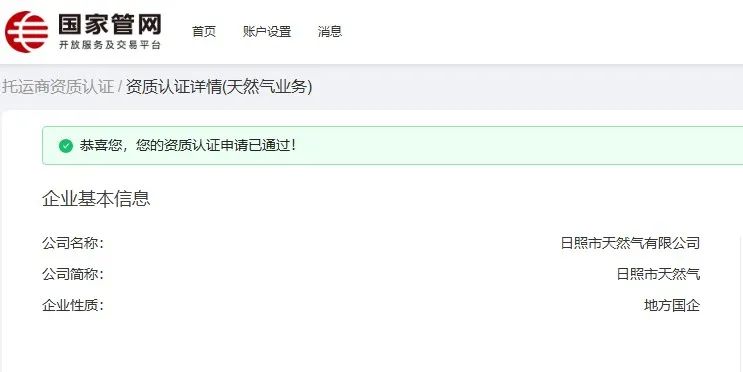 近日,集團所屬天然氣公司順利通過國家管網集團開放服務及交易平臺資質認證,成功取得國家石油天然氣管網集團有限公司托運商資質,成為日照市首家具備全國范圍內天然氣管道輸送資格的企業 。