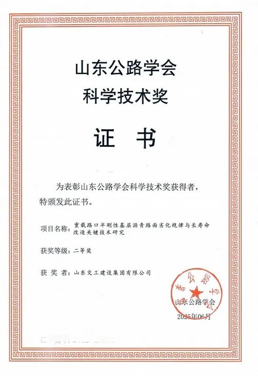 近日,山東公路學會組織評選的2025年度“山東公路學會科學技術獎”獲獎名單正式揭曉,山東交建集團聯合省交通科學研究院、市公路事業發展中心共同申報的創新成果——《重載路口半剛性基層瀝青路面劣化規律與長壽命改造關鍵技術研究》榮獲科技創新獎二等獎。