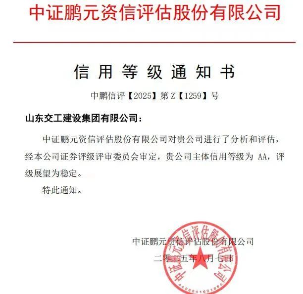 近日,山東交建集團完成主體信用等級復評,經國內權威信用評級機構——中證鵬元資信評估有限公司綜合分析和評估,維持公司“AA”主體信用等級,評級展望為“穩定”。